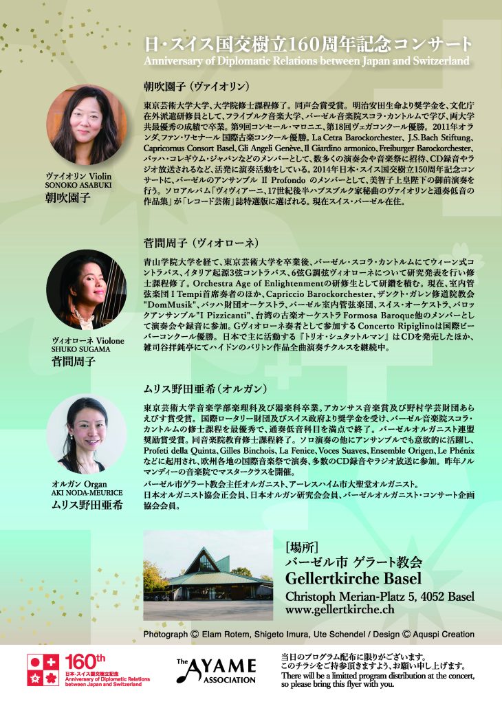 日本・スイス国交樹立160周年を記念コンサート / バーゼル 2/22(土) 2025年1月28日2025年1月28日 ayame-admin 日本・スイス国交樹立160周年を記念して、バーゼルでコンサートを開催します。 バーゼル音楽院スコラ・カントルムで学んだ音楽家による、バイオリン、ヴィオローネ、オルガンによるトリオです。 2025年2月22日(土)17時より Gellertkirche Basel (Christoph Merian-Platz 5, 4052 Basel) にて